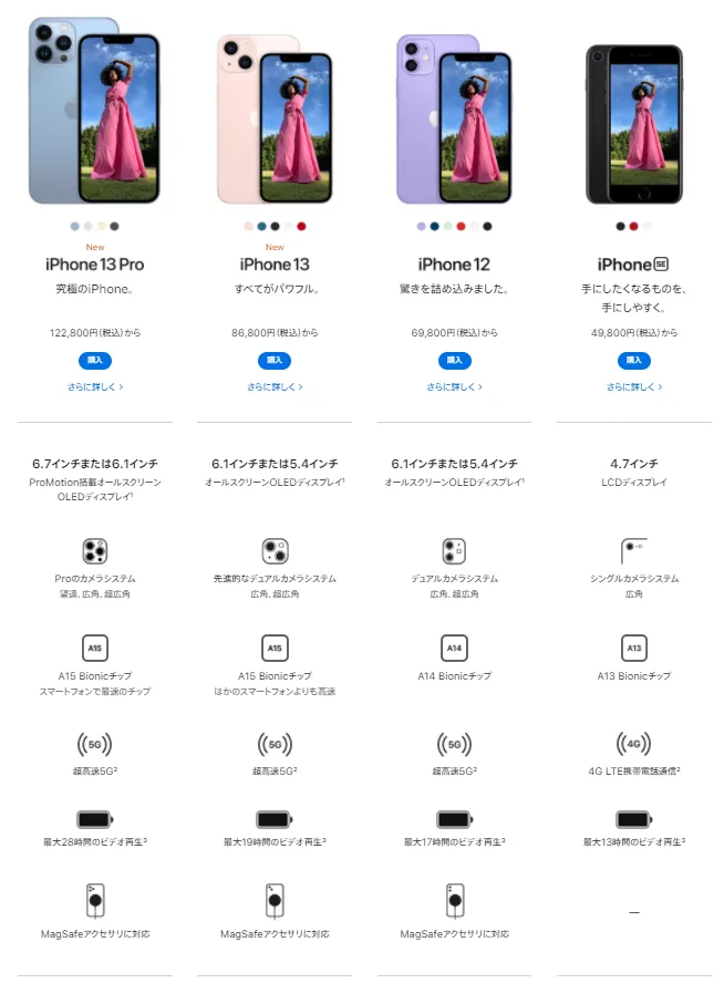 パソコン初心者にとって、パソコン購入の前に立ちはだかる壁が”スペック”です。皆さんはスマホを購入する際にどのくらい性能を考慮に入れますか?ほとんどの方は画面の大きさ、ベゼルの小ささなどのデザインを重視して、スマホ内部のコンピュータの性能を考慮に入れないと思います。しかし、スマホのスペックを考慮に入れなくても、内部のコンピュータが限界を超えないように設計されているため、どんなアプリでもカクカクせずに楽しめると思います。Appleの公式サイトでスペックを見てもらえばわかりますが、”あるか無いか”の機能が多く、比較しやすいですね。