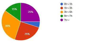 使用時間1時間未満を切る人はほとんどおらず、図のように使用時間は綺麗に分かれました。東工大は1コマ100分あるため、授業+αで作業してしまえば、スマホに飼われている私たちでも長時間使ってしまいますね。7時間以上使用しているヘビーユーザーが25%いたのは驚きました。