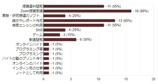 授業資料閲覧が意外にもそこまで高くない割合でした。おそらく授業資料はタブレット等の別デバイスで閲覧しているのかと思います。Zoom授業にある程度慣れてきたらタブレットでノート取って、パソコンでZoomを開く、のように工夫してみるとより快適に授業を受けることができますよ!